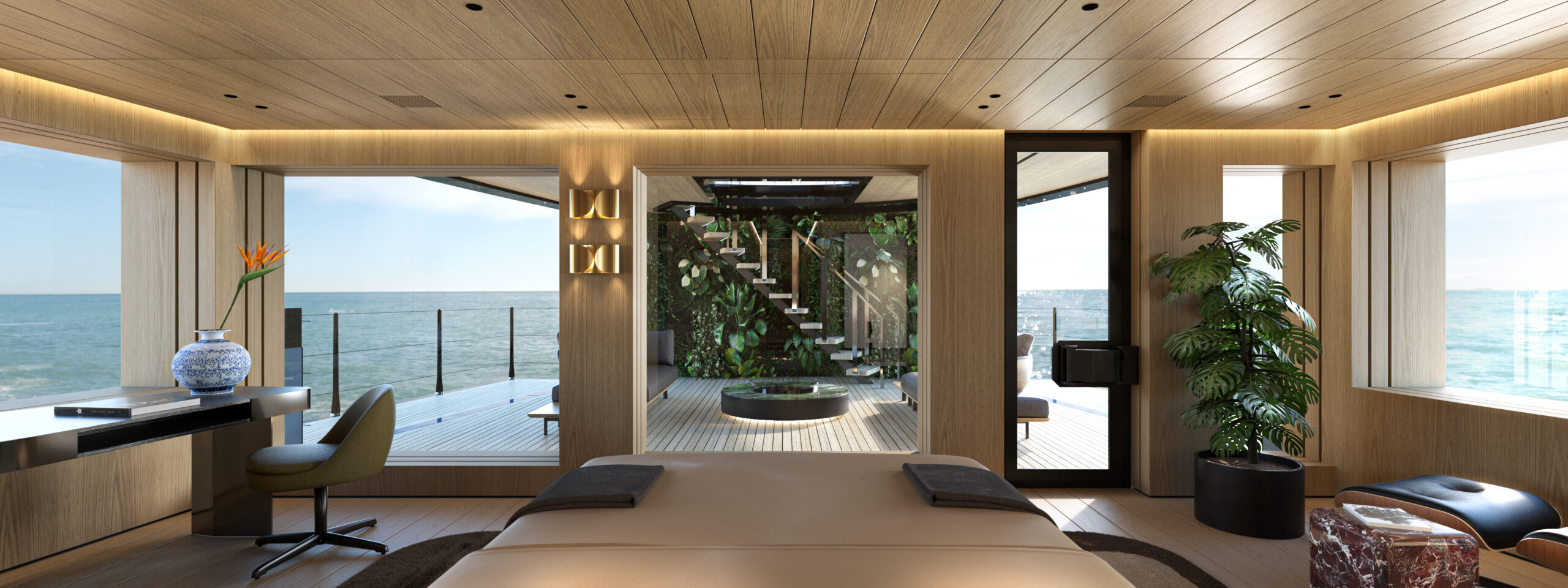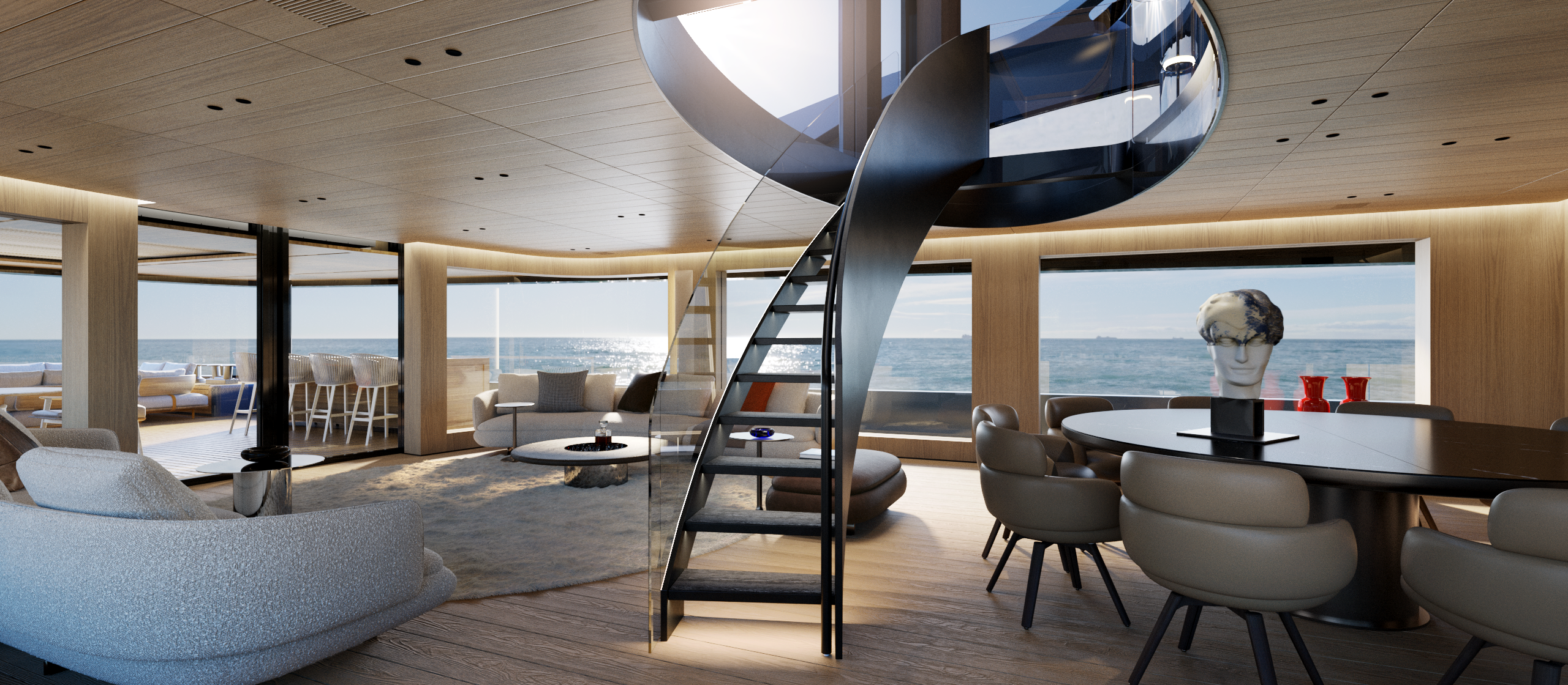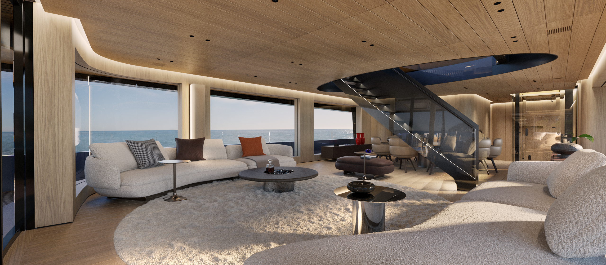 Inside, the P53 reveals interiors of rare equilibrium. Expanses of glass dissolve boundaries, while natural woods and sculptural lines create a dialogue of warmth and precision. The main salon flows around a central staircase like an architectural spine, linking luminous lounges with the owner’s suite and the skylounge above. Every detail, conceived by the Picchiotti Centro Stile, transforms volume into atmosphere, a language attuned to the lifestyle of today and the aspirations of a new generation of yacht owners. As Gianmaria Costantino, CCO of The Italian Sea Group, affirms, the P-Fleet embodies a contemporary voice that resonates with the visionary owners to come.