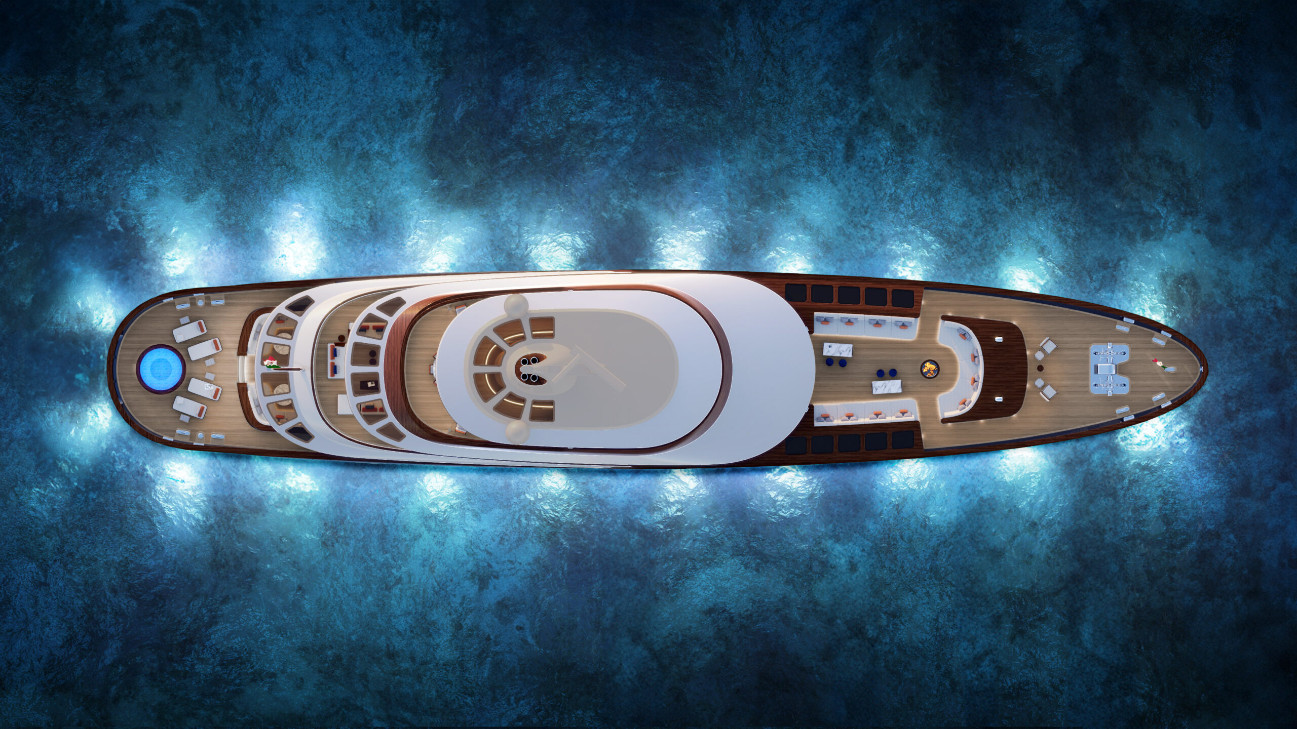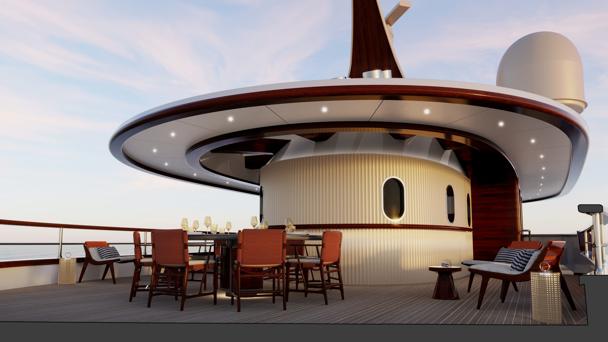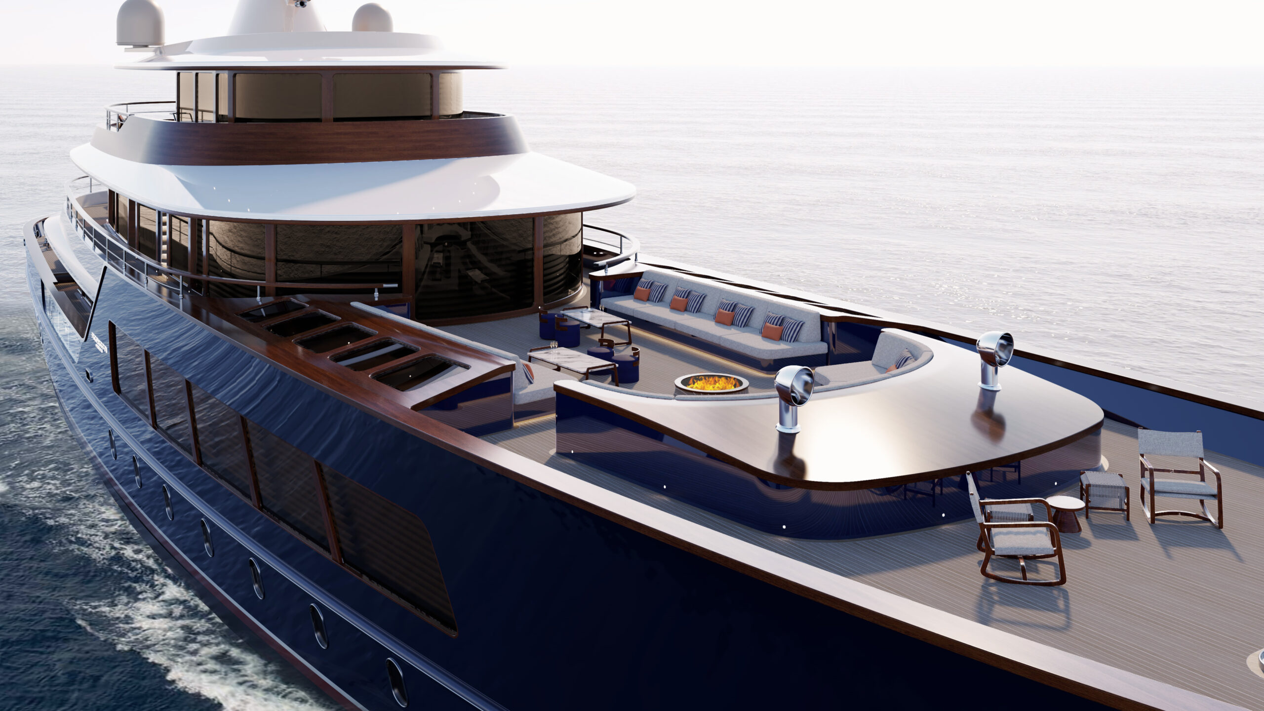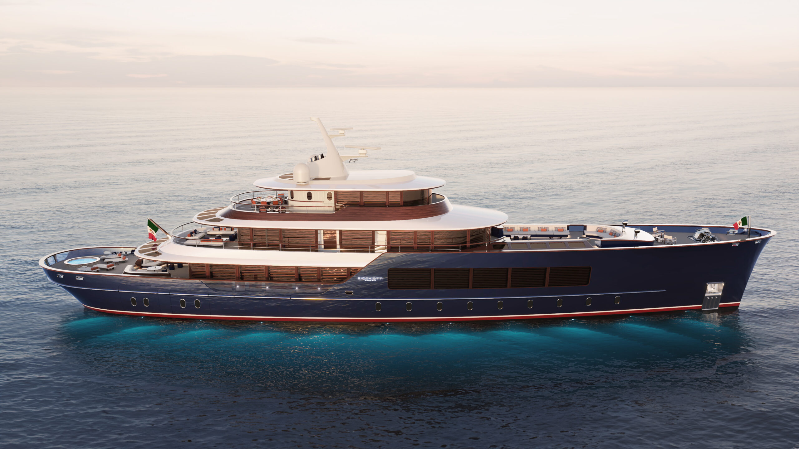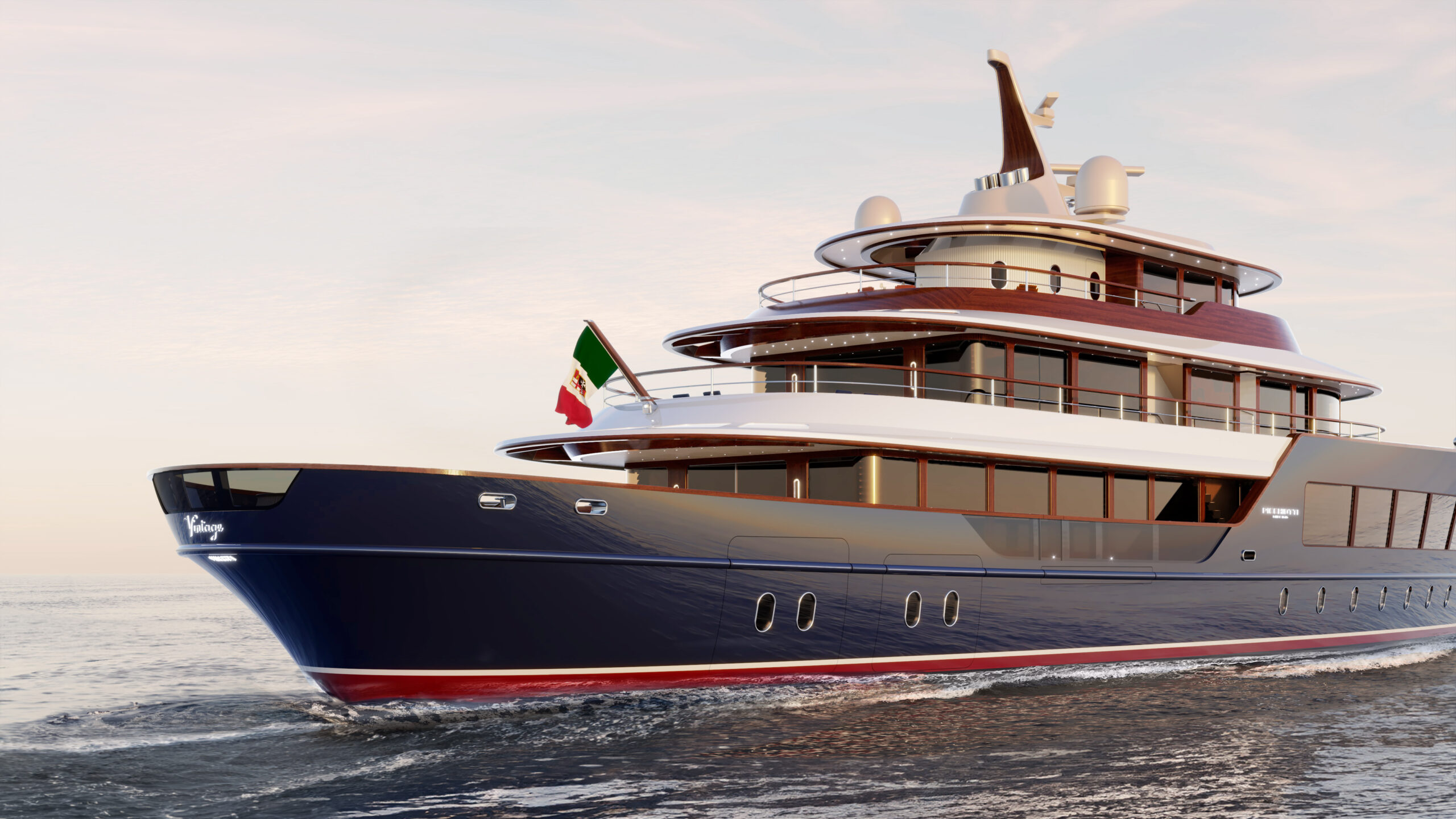 The 61-metre Vintage yacht concept embodies the timeless refinement of Picchiotti, reviving the distinguished lines of American yachting’s celebrated golden age. More than a design, she is an attitude: a seamless union of leisure, cultivated indulgence, and the visible expression of legacy. Powered by twin Caterpillar engines, Vintage glides at a comfortable 14 knots, with a top speed of 15.5 knots. Her systems integrate the latest in smart technologies, from automated controls to artificial intelligence, ensuring that her nostalgic spirit is matched by contemporary ease and efficiency.